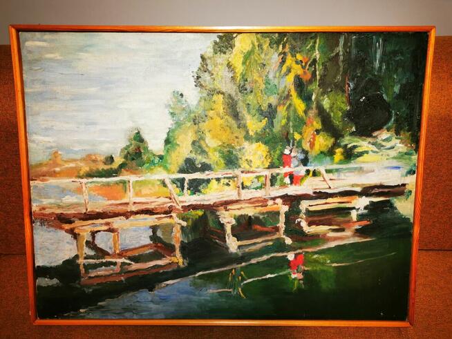 Sprzedam obraz w drewnianej ramie przedstawiający malowniczy krajobraz z mostem i odbiciem w wodzie. Wymiary: 62 x 82,50 ...
