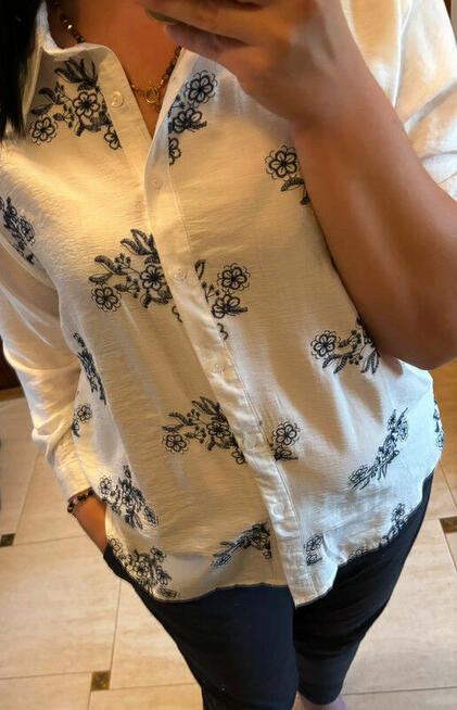 Elegancka koszula damska z haftem – biała z granatowymi kwiatami Wyjątkowa koszula damska w kolorze klasycznej bieli, ...